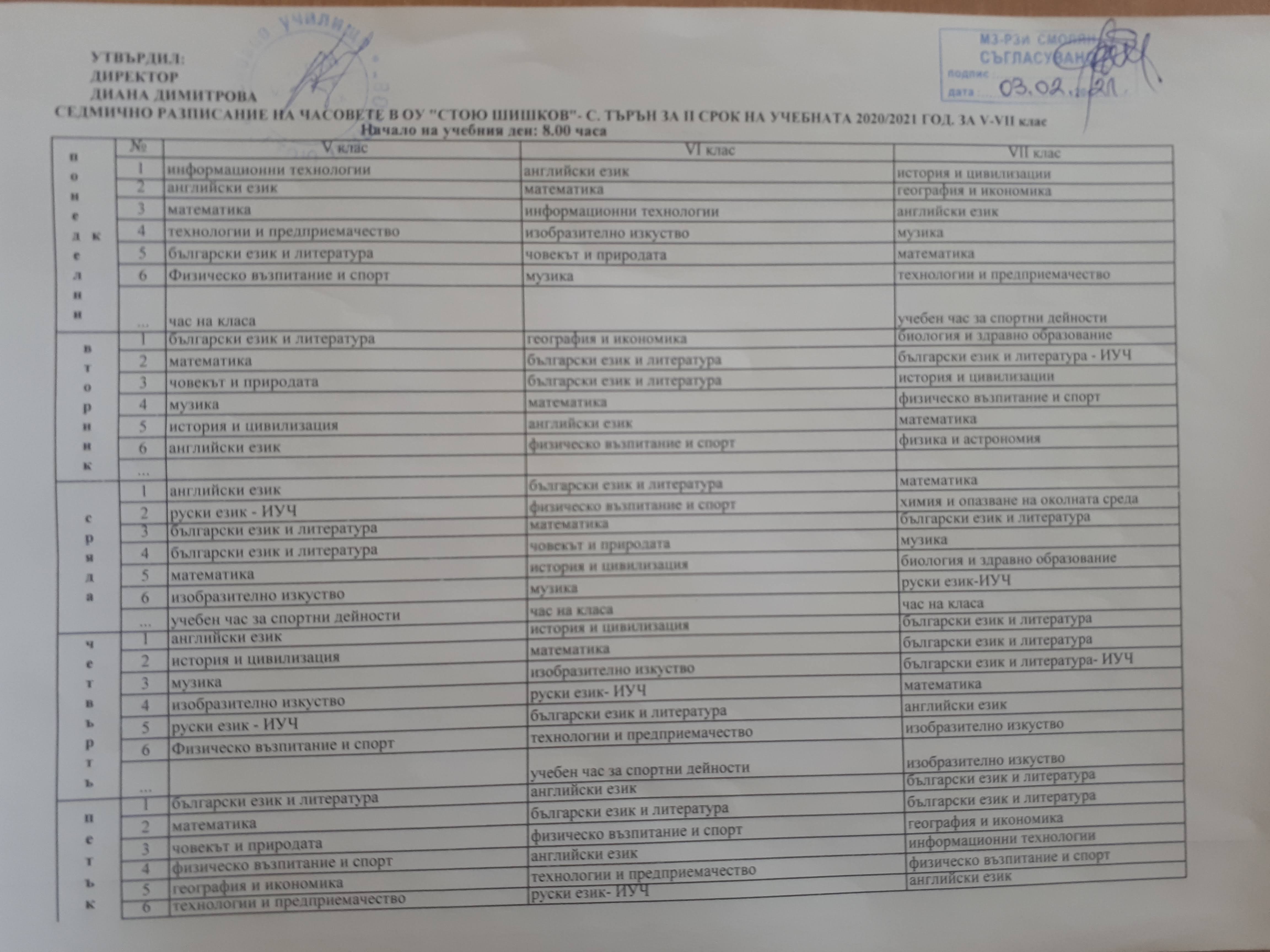 Седмично разписание за първи срок на учебната 2020-2021 година за V-VII клас