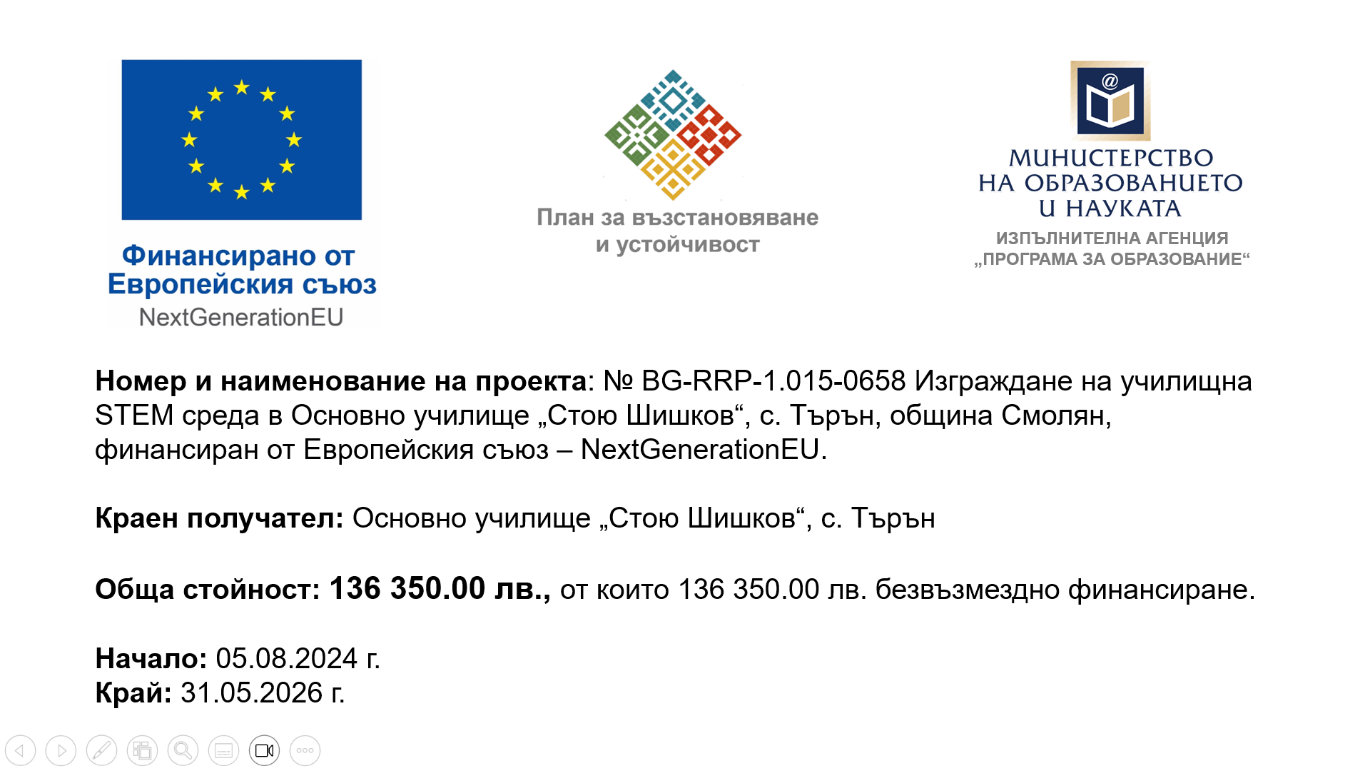 Шишков“, с. Търън, община Смолян“, по процедура BG-RRP-1.015 – „Училищна STEM среда“ по Националния план за възстановяване и устойчивост на Република България, финансиран от Европейския съюз финансиран по Националния план за възстановяване и устойчивост, процедура за предоставяне на средства от механизма за възстановяване и устойчивост BG-RRP-1.015 – „Училищна STEM среда“.
